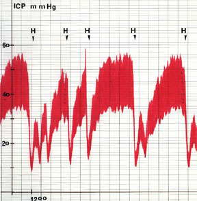 Abbildung 1 zeigt ein Beispiel für den zeitlichen Verlauf des Hirndrucks (ICP) bei einem Patienten. Es treten mehrere Episoden auf, bei denen der Hirndruck auf mehr als 55 mmHg ansteigt. Nach Behandlung durch eine spezielle Beatmungsform ("Hyperventilation", markiert in der Abbildung mit "H") sinkt der Hirndruck kurzzeitig ab.