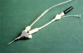 In Abbildung 2 ist eine Meßsonde dargestellt, mit der gleichzeitig der Hirndruck und der Sauerstoffgehalt im Hirngewebe gemessen werden kann. Nur die beiden links unten in der Abbildung zu erkennenden "Drähte" kommen im Gehirn zu liegen, die übrigen Anteile der Sonde dienen der Befestigung am Kopf beziehungsweise dem Anschluß der Meßkabel.