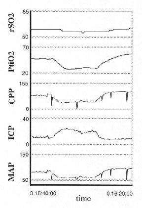 Abbildung 3 zeigt ein Beispiel für "multimodales Neuromonitoring", das heißt das gleichzeitige Erfassen von Meßdaten aus dem Gehirn: In der Mitte der Abbildung erkennt man einen Anstieg des Hirndrucks "ICP", der begleitet ist von einem gleichzeitigen Abfall des Blutdruckes "MAP". Dies führt zu einem Abfall des Sauerstoffgehaltes in den Hirngefäßen ("rSO2") als auch im Hirngewebe selbst ("PtiO2").