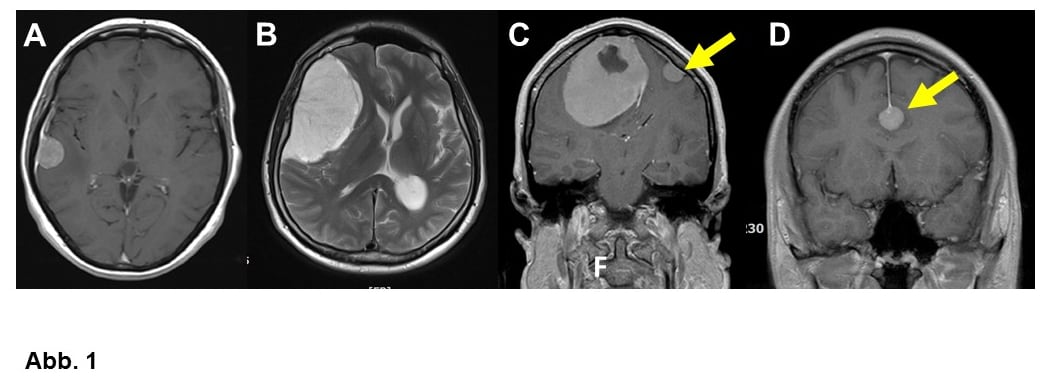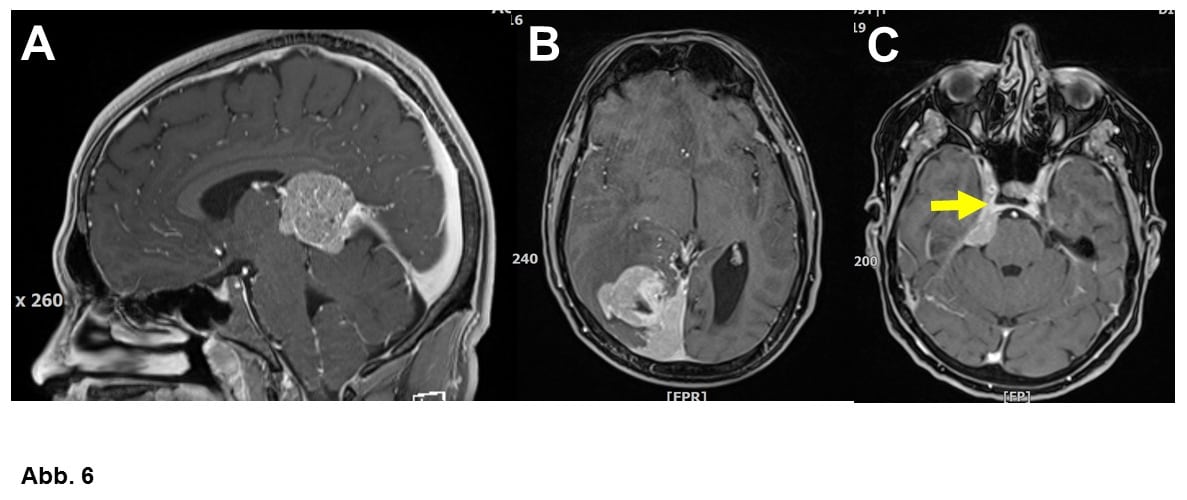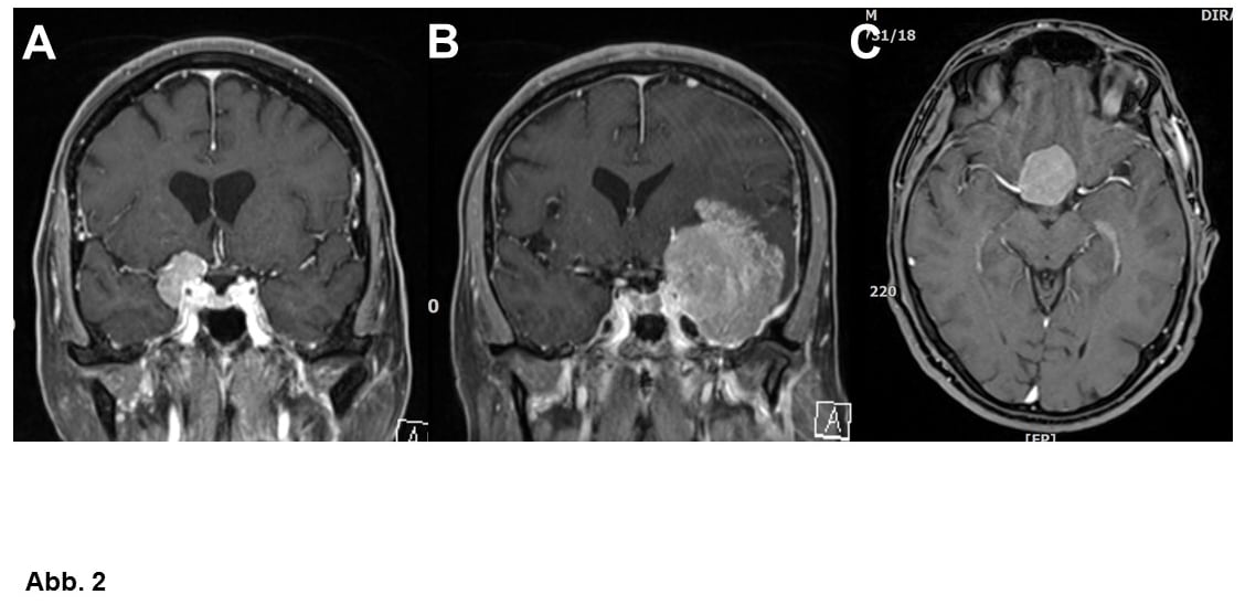 A. 20-jähriger Patient mit einem atypischen Meningeom WHO-Grad II. Hier gelang trotz der schwierigen Lage eine Komplettentfernung, so dass man auf eine Nachbestrahlung verzichten konnte.