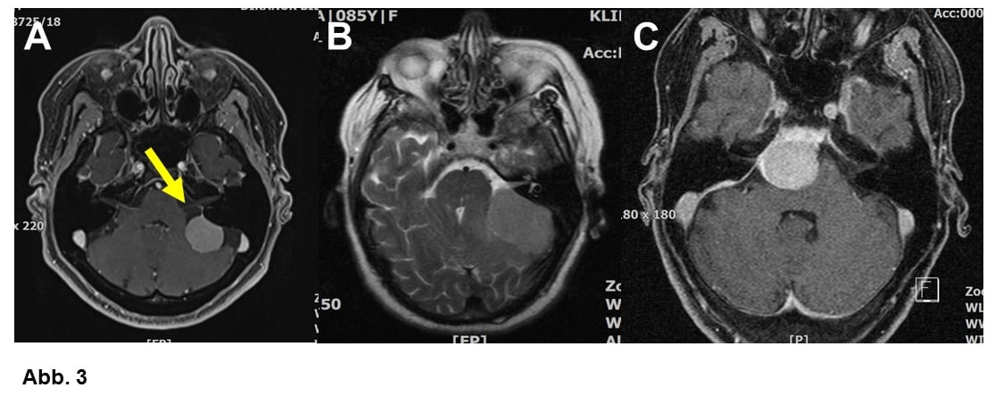 C. 54-jährige Patientin. Der Tumor drückte auf den Hirnstamm, die Patientin hatte eine leichte Lähmung. Die Operation war in diesem Fall wegen der großen Nähe zu wichtigen Blutgefäßen und Nerven besonders schwierig.
