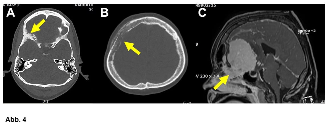 B. Konvexitätsmeningeom mit ausgedehntem Knochenbefall (69-jähriger Patient, Pfeil). Bei diesem Patienten lag ein atypisches Meningeom WHO-Grad II vor. Im Rahmen der Operation mußte der Knochen entfernt und durch ein Implantat ersetzt werden.