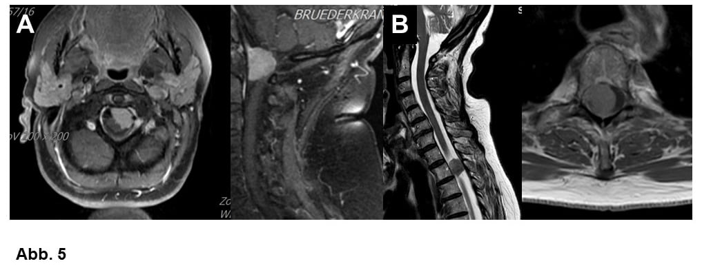 B. Meningeom im Rückenmarkskanal, 78-jährige Frau. Trotz der sehr deutlichen Verdrängung des Rückenmarks sind solche Tumoren meist gut zu operieren.
