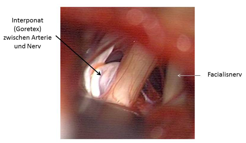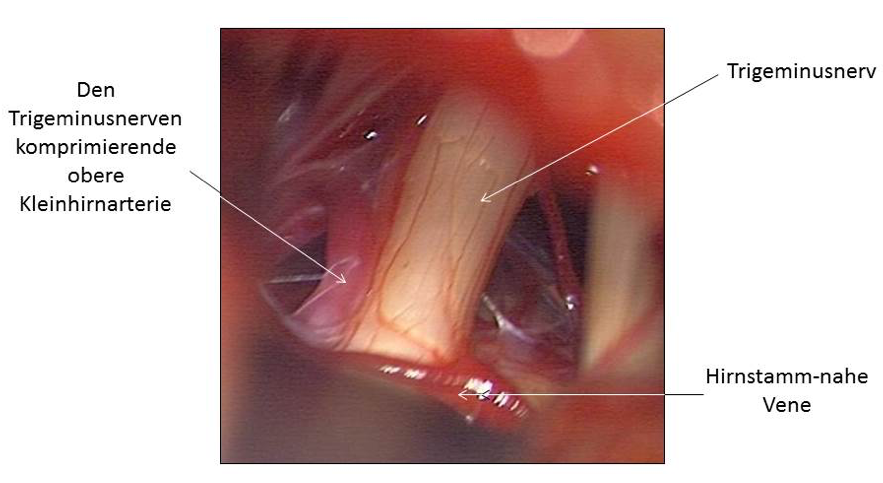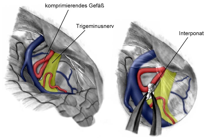 Bereits vor 70 Jahren bemerkte ein amerikanischer Neurochirurg bei Operationen im Bereich der hinteren Schädelgrube Abnorme Gefäßverläufe Bereich des Trigeminusnerven. Anfang der 60er Jahre wurde dann das Konzept der Kompression des Nerven durch ein, in der Regel, arterielles Gefäß im Bereich des Austritts des Nerven aus dem Hirnstamm weiter verfeinert und die Methode der mikrovaskulären Dekompression entwickelt. Dieser Eingriff erfolgt in Vollnarkose. Über einen Schnitt hinter dem Ohr wird ein 5-Mark Stück großes Knochenfragment herausgesägt und anschließend unter dem Operationsmikroskop der Trigeminusnerv aufgesucht. Zeigt sich eine Arterie, die den Nerv einengt oder bedrängt, so wird diese vorsichtig losgelöst und ein kleines Stückchen Kunststoff als Puffer zwischen Gefäß und Nerv eingefügt (vgl. Abbildungen). Diese Operation wird nach einem der Pioniere auch Jannetta-Operation genannt. Die Ergebnisse nach der Operation sind außerordentlich gut. Circa ¾ aller Patienten sind nach der Operation anhaltend, d.h. über 10 bis 20 Jahre schmerzfrei.