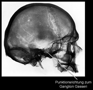 Bei diesen Verfahren wird ein Nervenknoten an der Schädelbasis (das sog. Ganglion Gasseri) mit einer Kanüle, die neben dem Mundwinkel eingestochen wird, aufgesucht (vgl. Abbildung). Anschließend versucht man mit einer gezielten Hitzeläsion (Thermokoagulation) oder Alkoholinjektion (Glyzerolinstillation) einen oder mehrere Äste des Trigeminusnerven kontrolliert zu schädigen, um die Schmerzentstehung und –weiterleitung zu unterbinden. Bei diesen Verfahren handelt es sich um neurochirurgische Routineeingriffe, die weltweit bei mehreren Tausend Patienten mit anhaltend gutem Erfolg eingesetzt wurden. Weitere Verfahren sind die Ballonkompression des Ganglion Gasseri oder die ganglionäre lokale Opioidapplikation (GLOA).